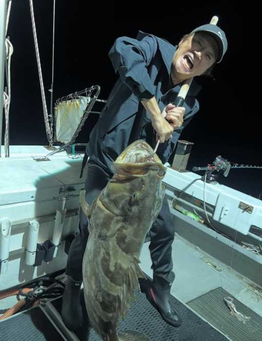 写真では、夜の船上で釣り上げたクエを誇らしげに掲げる近藤の姿が収められている。