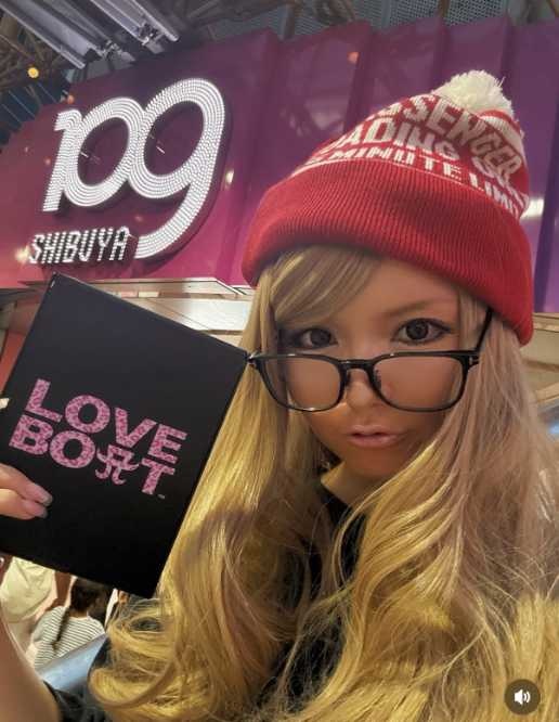 赤いニット帽にゆる巻きの金髪、くっきりしたアイラインと濃いめのチークという、2000年代を代表するギャルスタイルで登場している。手には黒地にピンクの文字で「LOVE BOAT」と書かれたミラーを手に持ち、当時のギャルカルチャーを彷彿とさせる1枚だ。