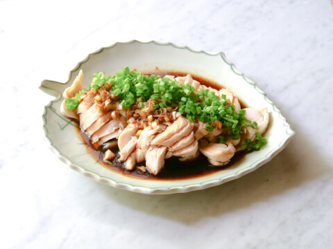しっとりとしたゆで鶏に、香味野菜がたっぷりのタレがかかった一品です。