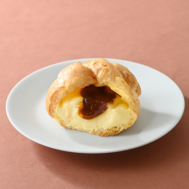 こちらのシュークリームは、プリンの味わいを再現した一品です。その中身は、ホイップクリームと合わせたカスタードクリーム、そして、とろりとした食感のほろ苦いカラメルソースという、二層のフィリングで構成されています。