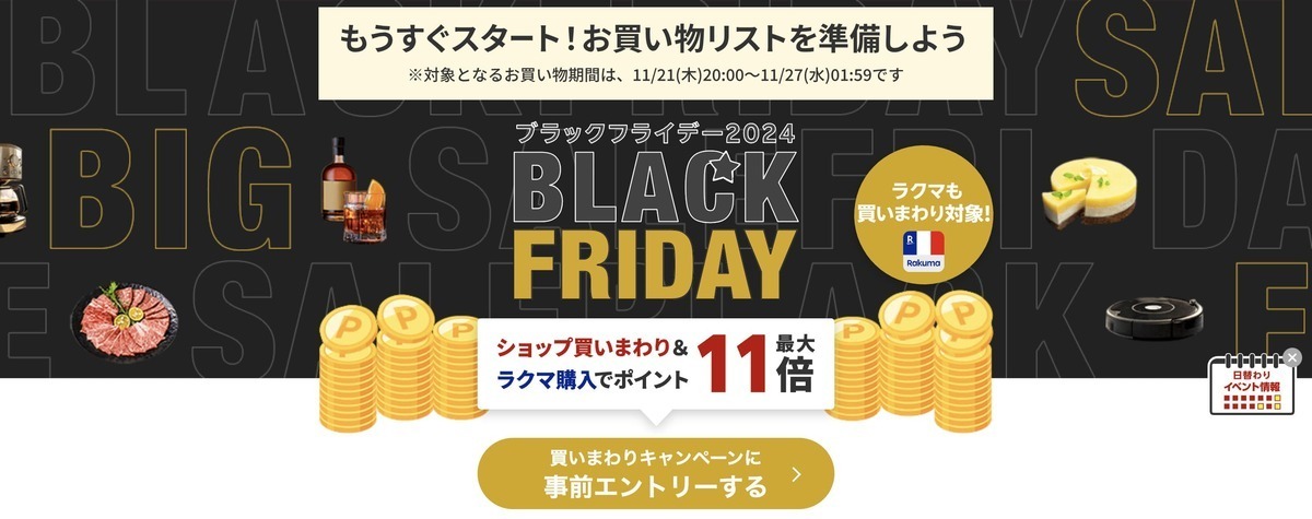 ブラックフライデーの期間中:合計10,000円(税込)以上の買い物をするとポイント還元率がアップするキャンペーンが開催されるので、忘れずにエントリーを。