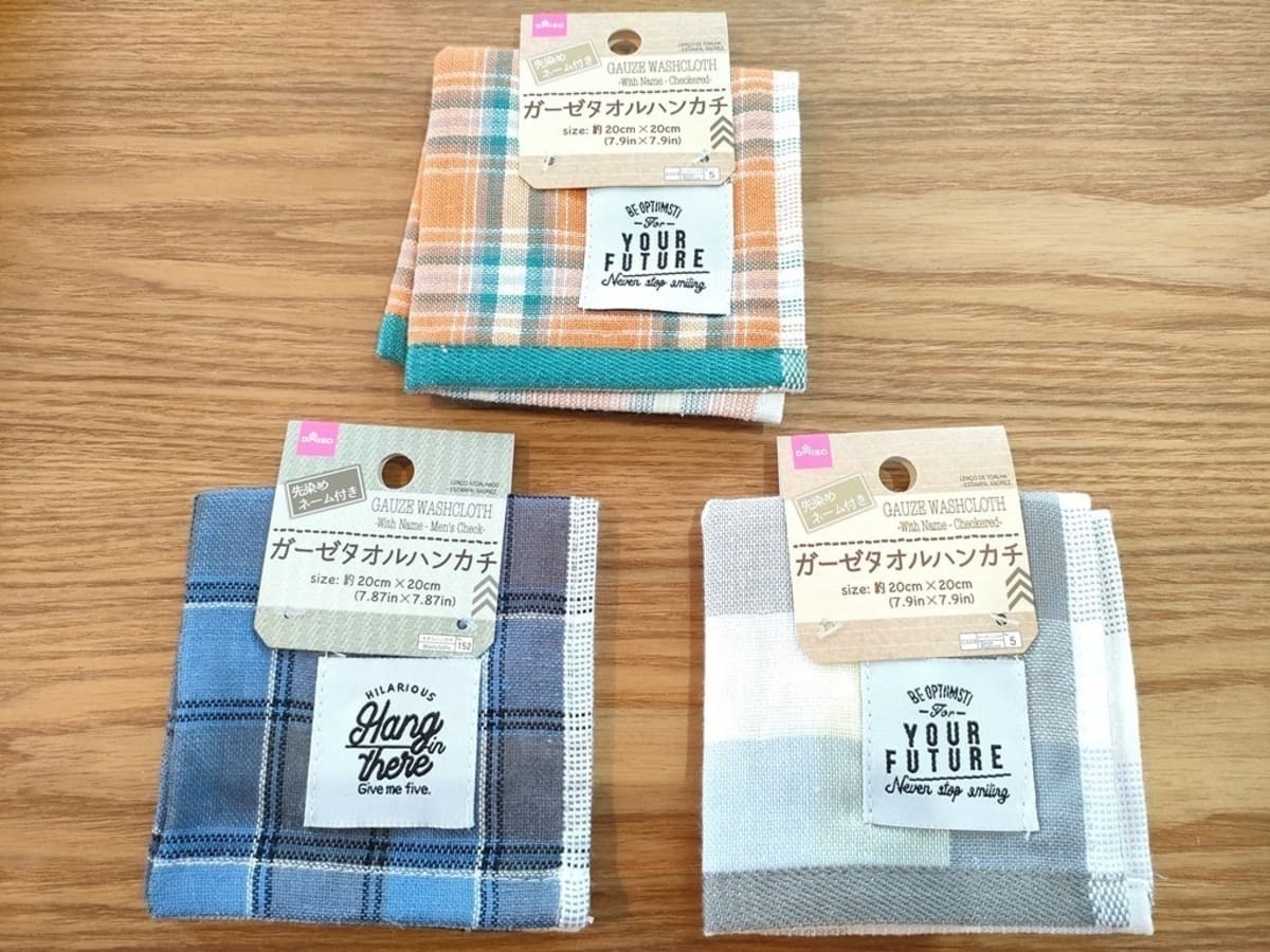 毎日使うハンカチは何枚かストックが必要ですよね。お子さんがいる場合はさらに何枚も用意しておく必要がありますが、すぐに汚れるためコスパの良い物を求めている方も多いのではないでしょうか?そんな時に頼りになるのはやっぱりダイソー!見た目もオシャレで100均で買ったとは思えないクオリティーなんです。