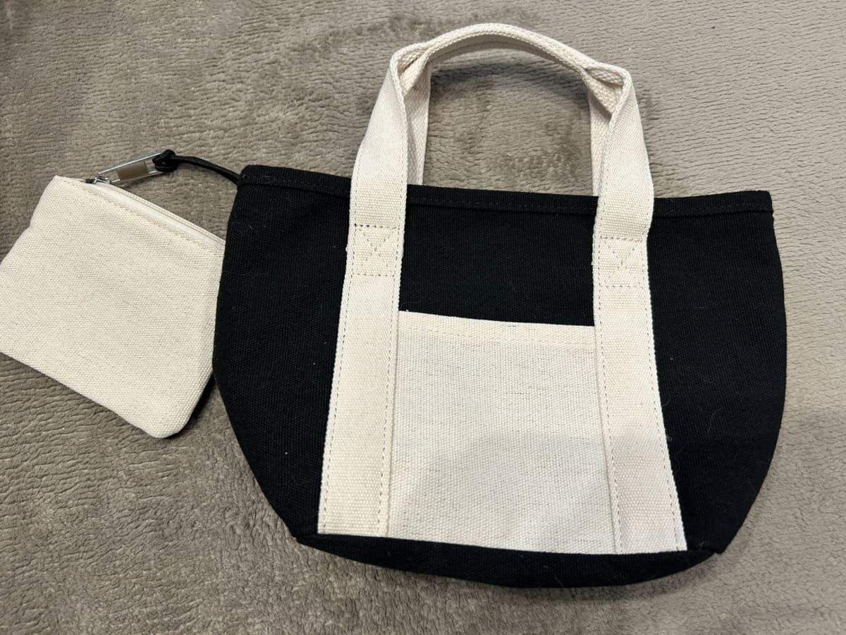 約16.5×16×11cmというミニサイズのトートバッグに、約9×12.5cmのポーチがセットになった一品。
