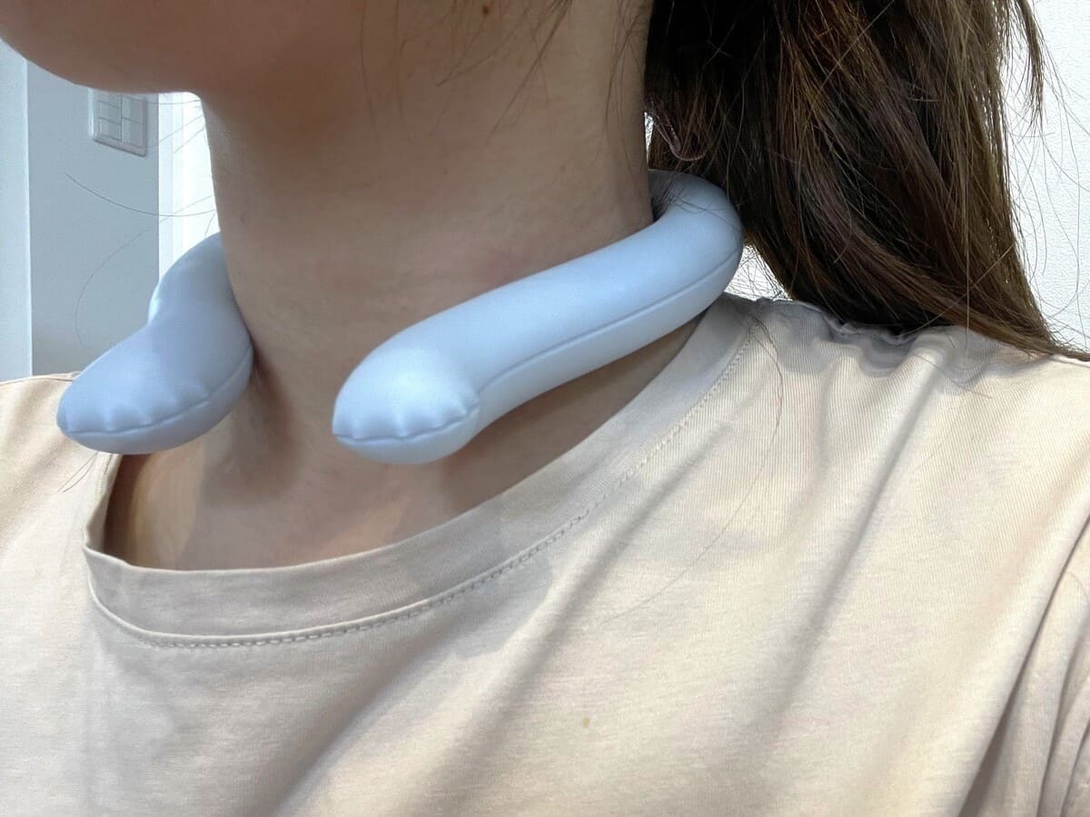 首元をひんやり冷やすクールネックバンドは、比較的やさしい冷たさ!保冷剤を首に当てたときのような鋭い冷たさは一切ありません。