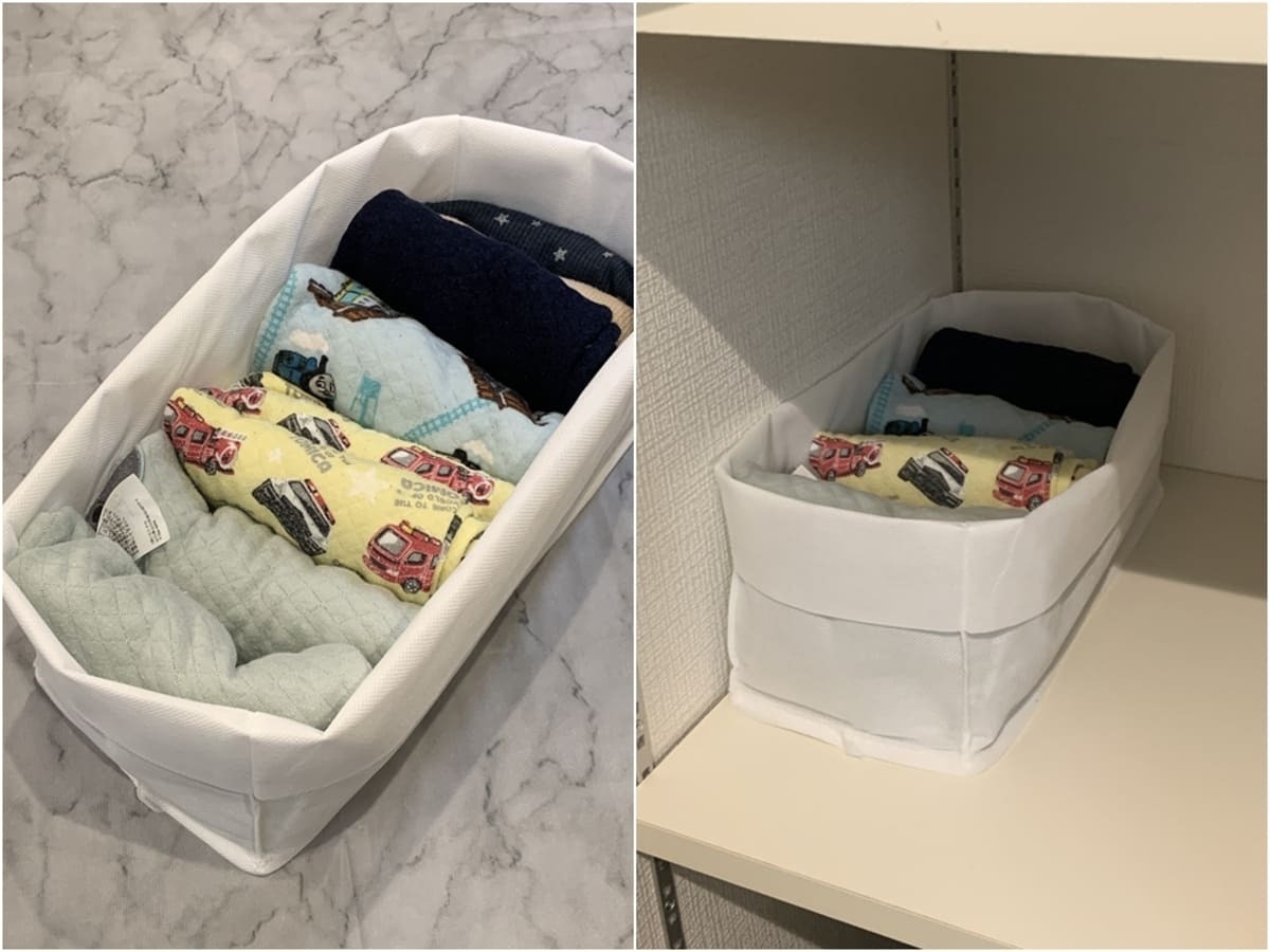 我が家では子供の冬用のパジャマを収納!分厚いキルト生地のパジャマですが、上下4着セットを収納できました♪