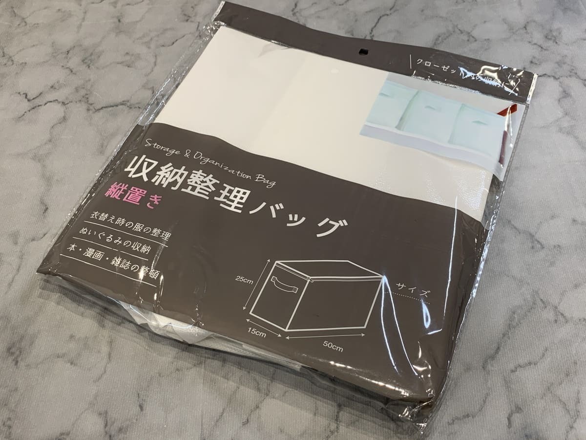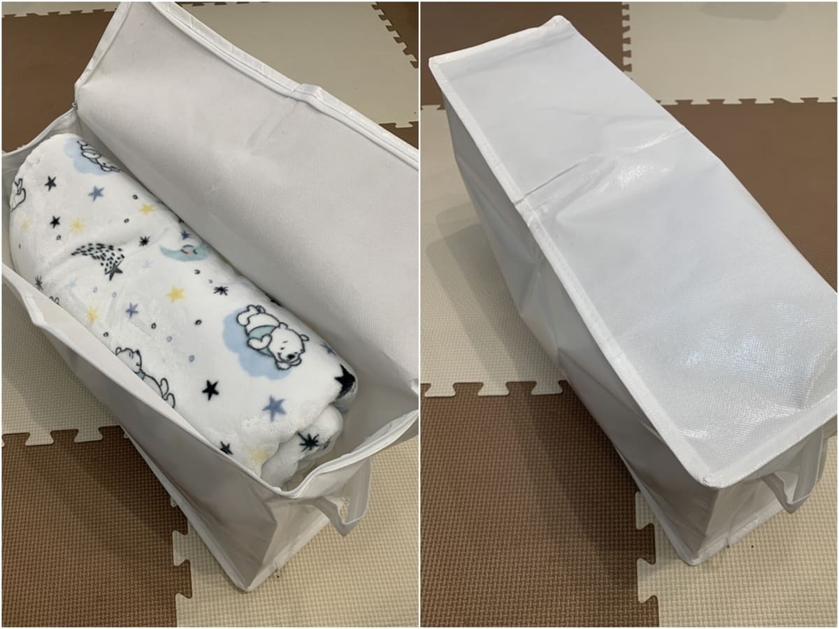 衣類・ぬいぐるみ・本などを整理できる収納バッグ!100均ながら容量のあるアイテム、ブランケットもコンパクトに収納できました!