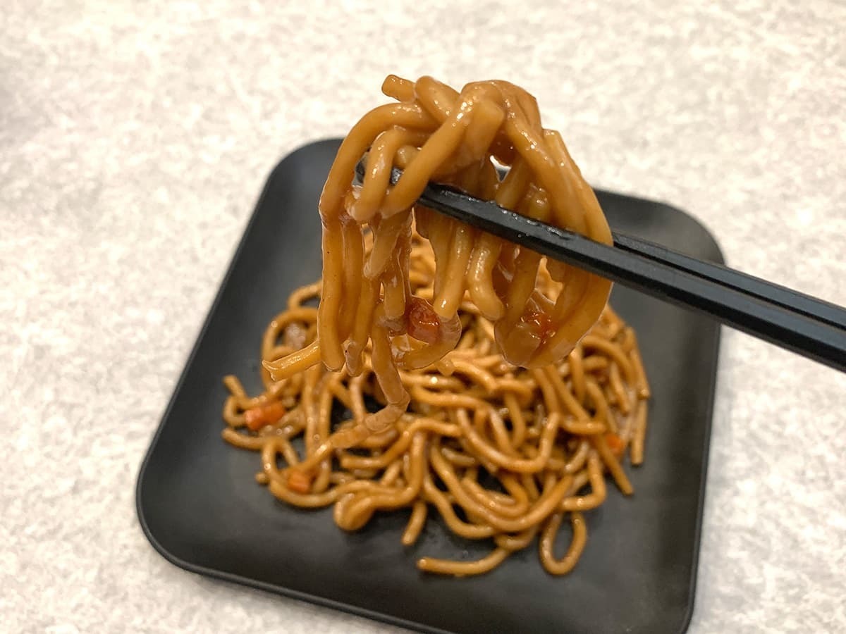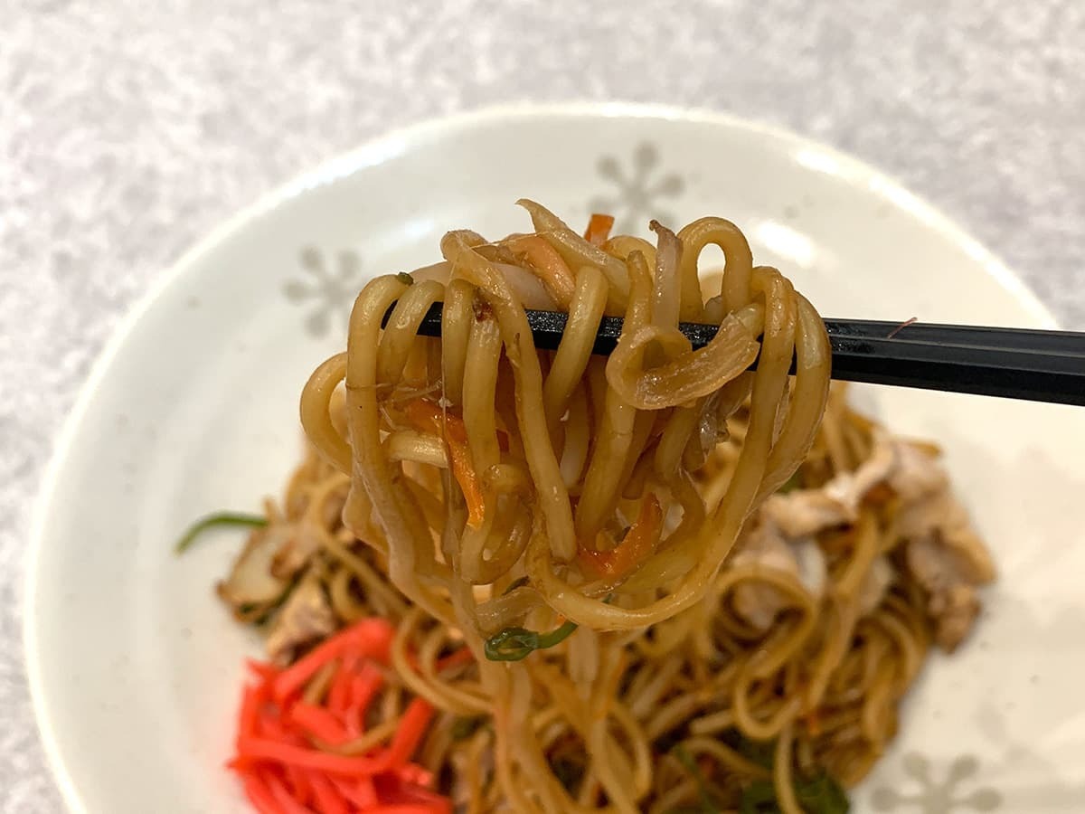細麺タイプの焼きそばで、スルスルと食べやすいのが魅力!食感については硬すぎず柔らかすぎずで、万人受けするような麺でした!