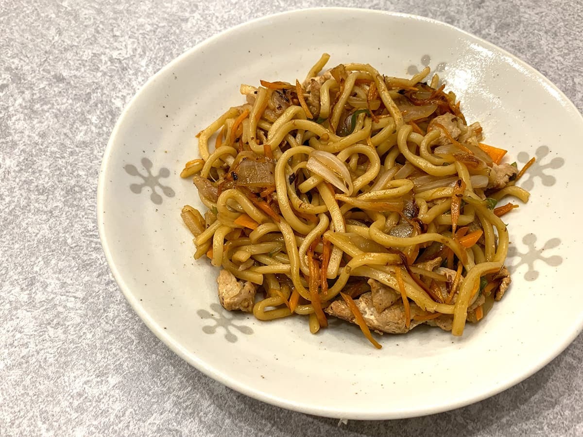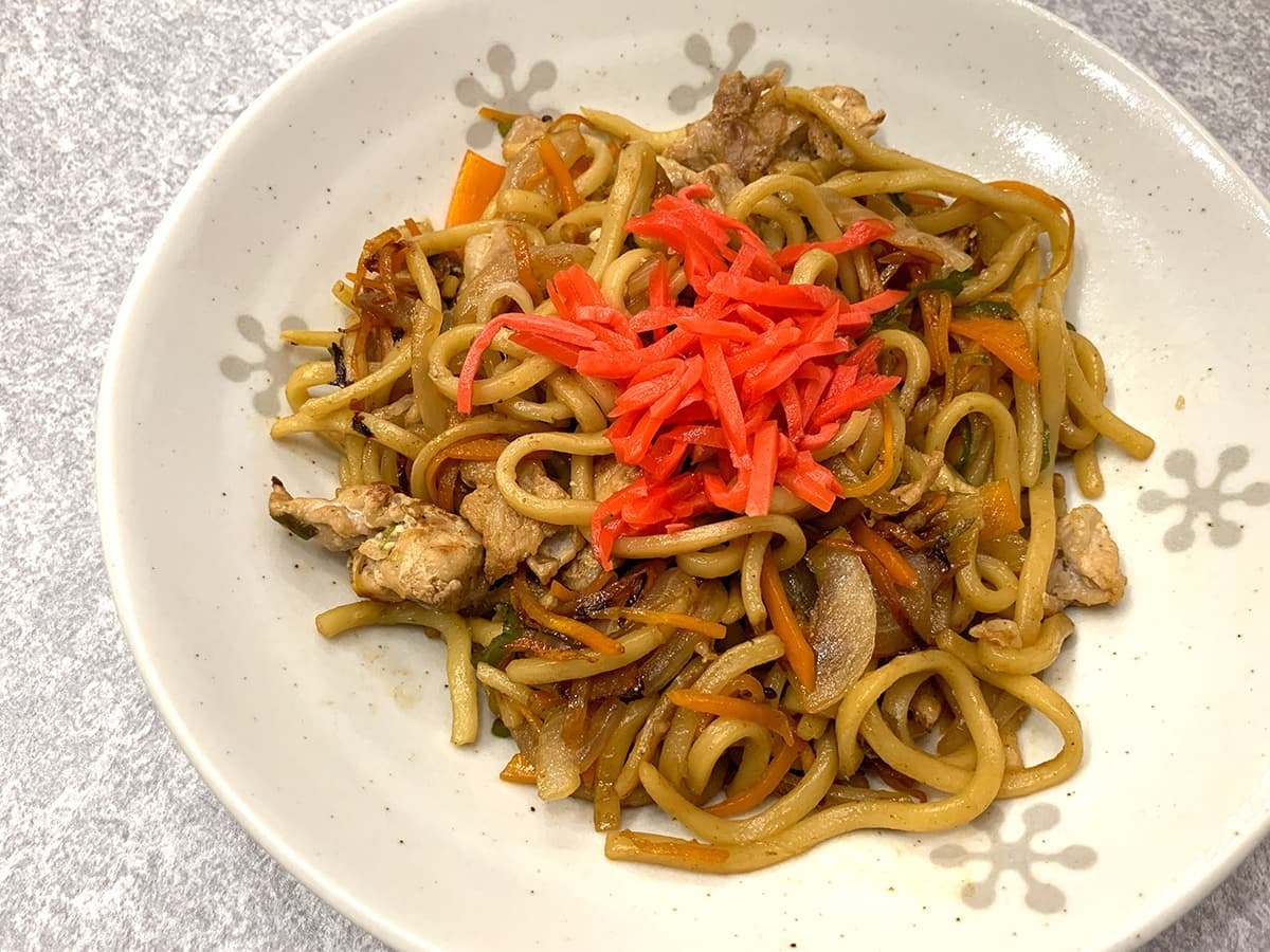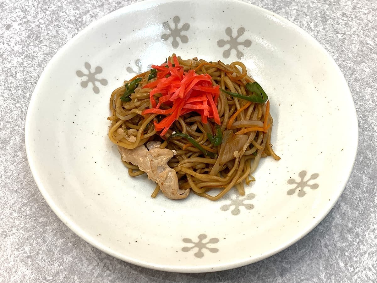 早速焼きそばをお皿に盛り付けてみました。艶やかなソースの照りが非常に美味しそうで、しっかり味も染みていそうですよね♪