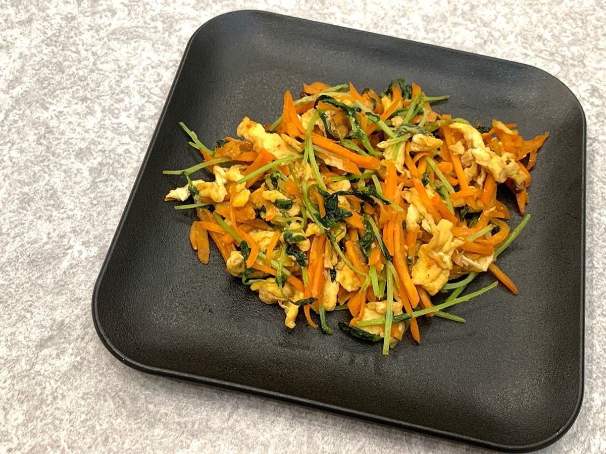 焼きそば以外にも少し野菜が欲しかったので、にんじん・豆苗・卵をオイスターソースで炒めて一品作ってみました。炒め物もオイスターソース一本でササッと作れますよ♪