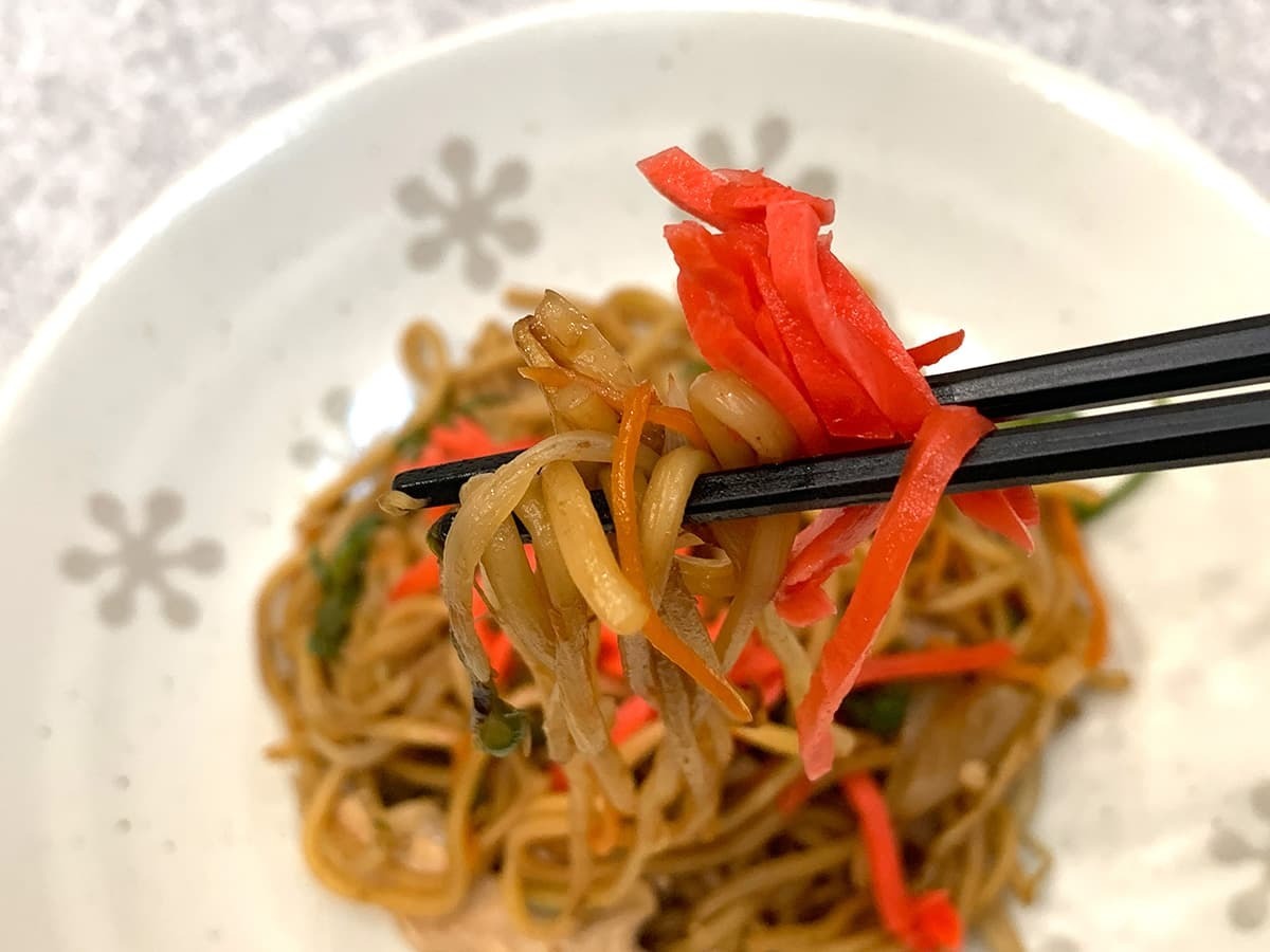 紅生姜はなんと言っても、さっぱりした酸味が魅力!焼きそばの濃厚なこってりソースに紅生姜の酸味が加わるだけで、食べやすさが一気にアップしました!