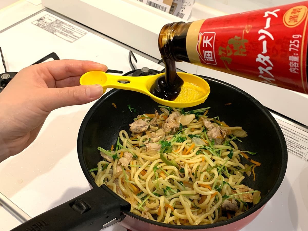 先ほどご紹介しましたオイスターソースより少々味が濃いめなので、麺1玉につきソースは大さじ0.5杯以下でも良さそう!少量で味が決まるため、結果的にコスパも良くなりますよ♪