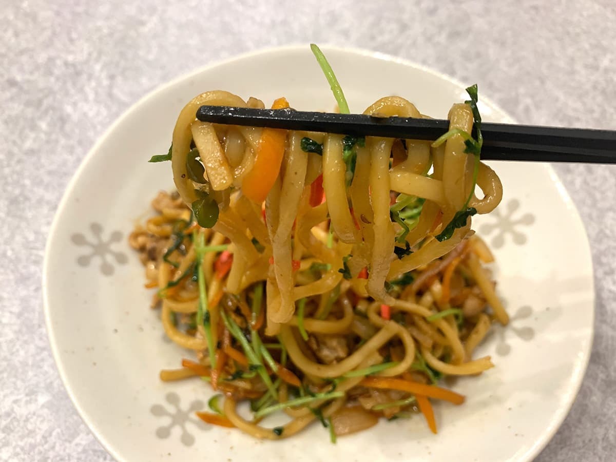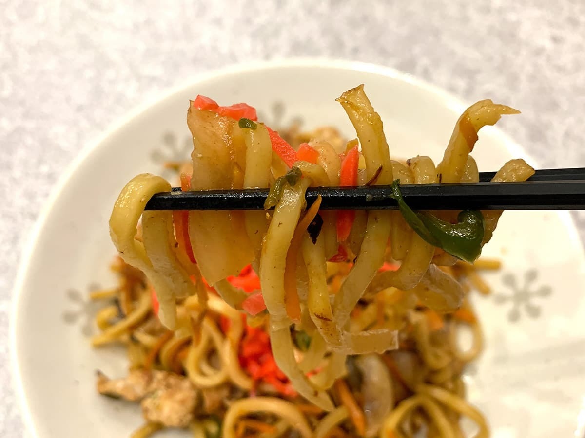 一口目から弾力のあるもちもち食感でびっくり!太麺の中にはただ柔らかいだけの商品もありますが、業務スーパーの太焼そばはしっかりコシがあり、食べごたえ抜群です!