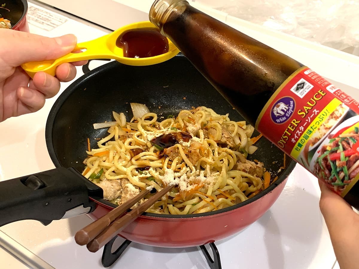 このオイスターソースを使用し、早速焼きそばを作っていきます。料理本のレシピを参考に、焼きそば1玉あたりオイスターソース大さじ0.5杯、鶏がらスープ大さじ0.5杯、こしょう少々で味付けしました。