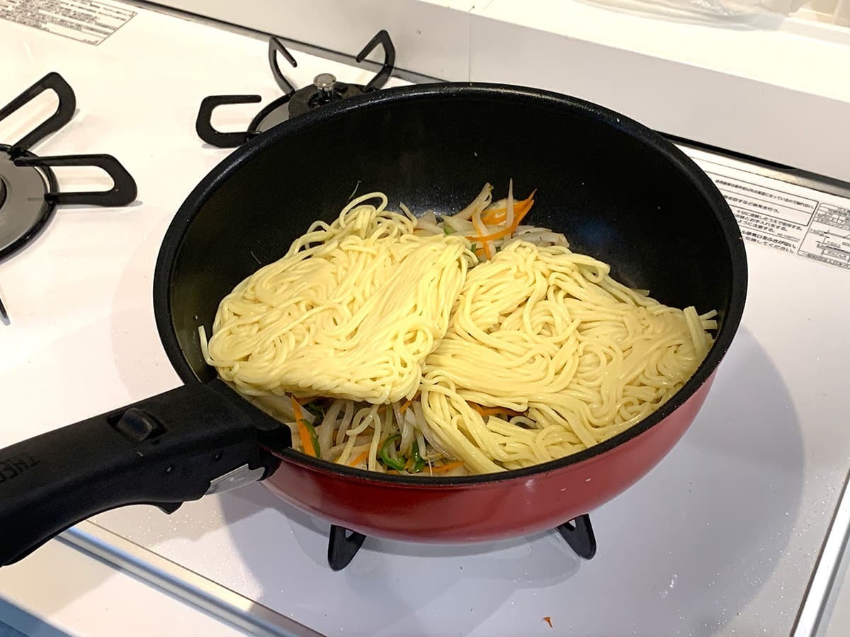 調理する際は炒めた具材に麺と水30mlを入れ、麺をほぐしていきます。水分がなくなり麺が炒め上がったら、粉末ソースを入れ混ぜて完成させましょう!