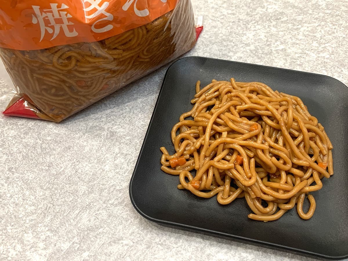 本商品は焼きそば麺のみなので、ご自身で味付けを行いましょう!筆者はシンプルに焼きそばソースを使用し、味付けしてみました。