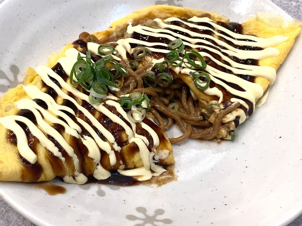 1kgの大容量焼きそばなので、アレンジして食べるのもおすすめ!今回は焼きそばを卵で包んだオムそばを作ってみました。