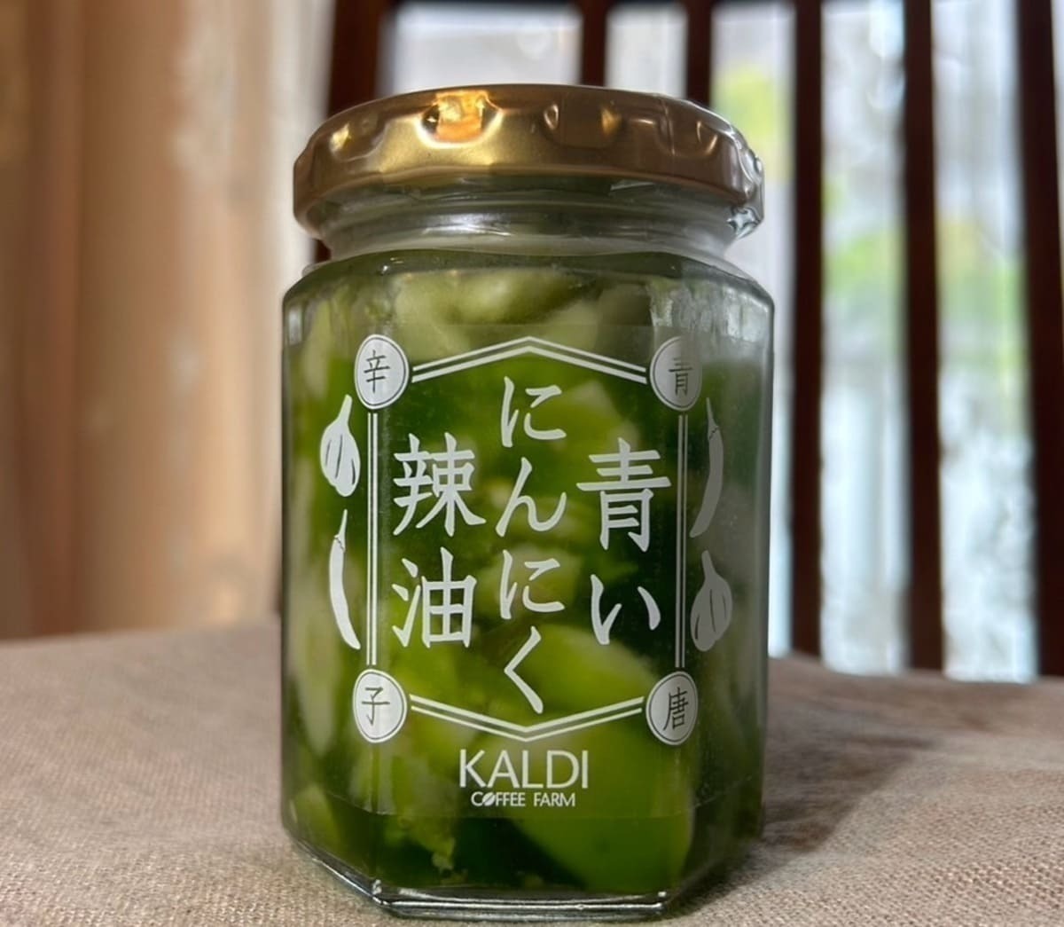 鮮やかなグリーンのにんにく辣油は、にんにく、青唐辛子、ごま、わさび菜が入った人気の調味料!