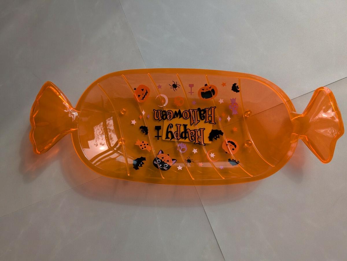 大きなキャンディーの形をしたオレンジ色のトレイで、見た瞬間に気分が上がるデザインです。