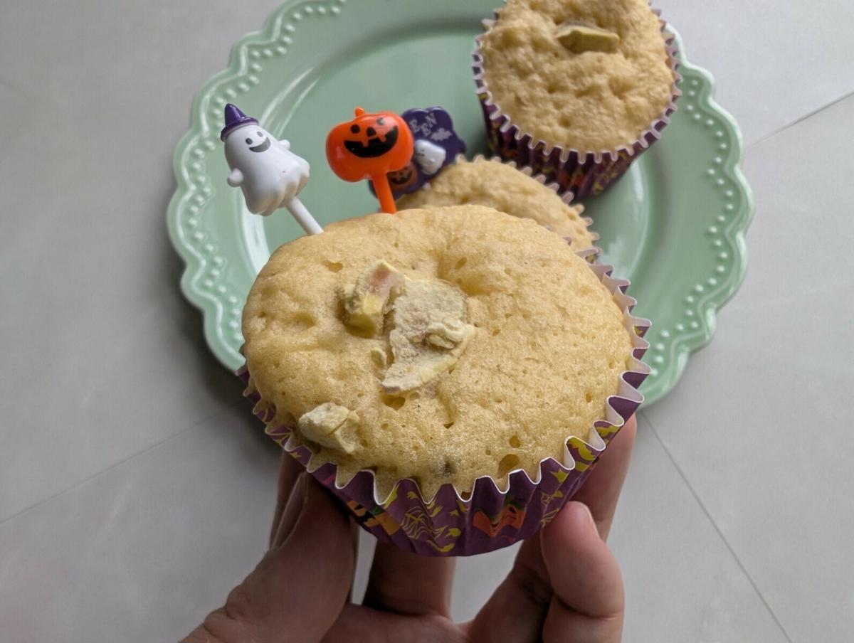 ホットケーキミックスを入れて電子レンジで3分チンするだけで、ふんわりカップケーキが完成。