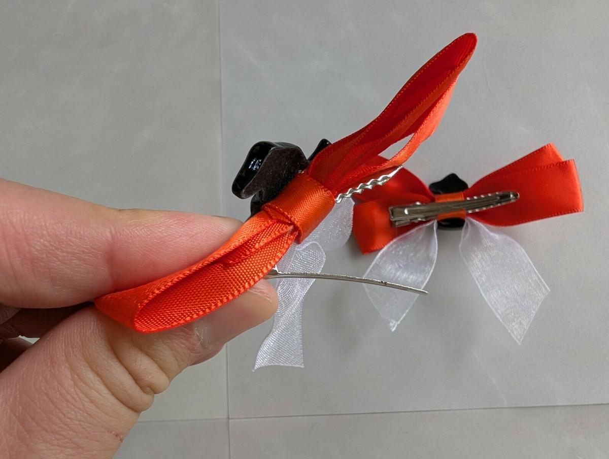 大きなオレンジのリボンに魔女帽子のチャームが付いたヘアピンもおすすめ。