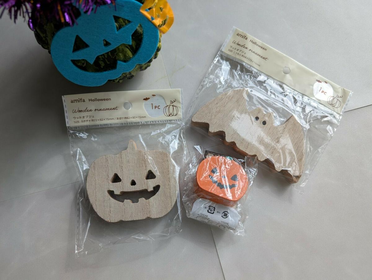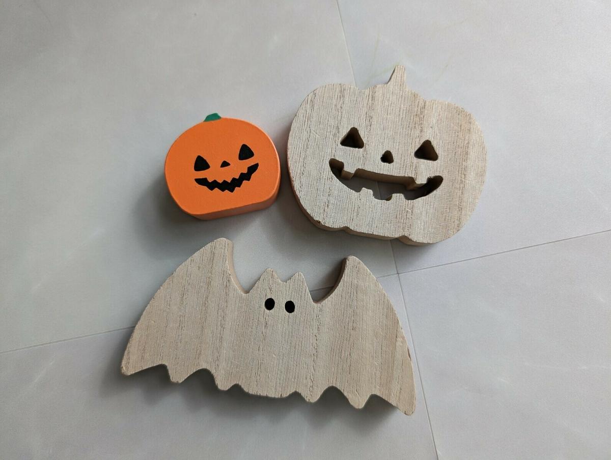 かぼちゃやこうもりをかたどった木製オーナメントで、ナチュラルな木の質感が特徴。
