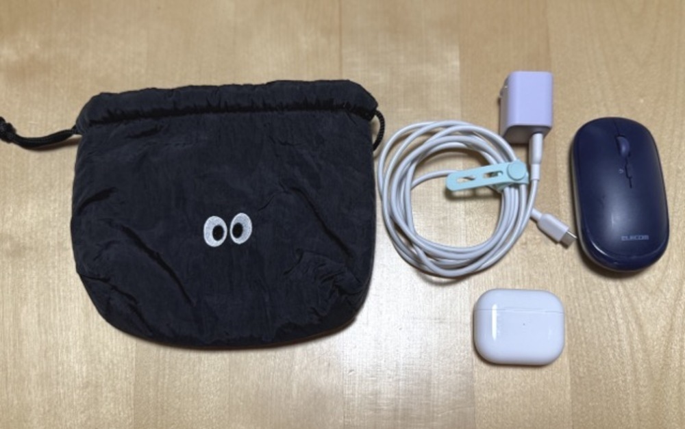 コスメや充電ケーブルなどの持ち運びには、ガサッと入れて傷つかない巾着が好きなんです。