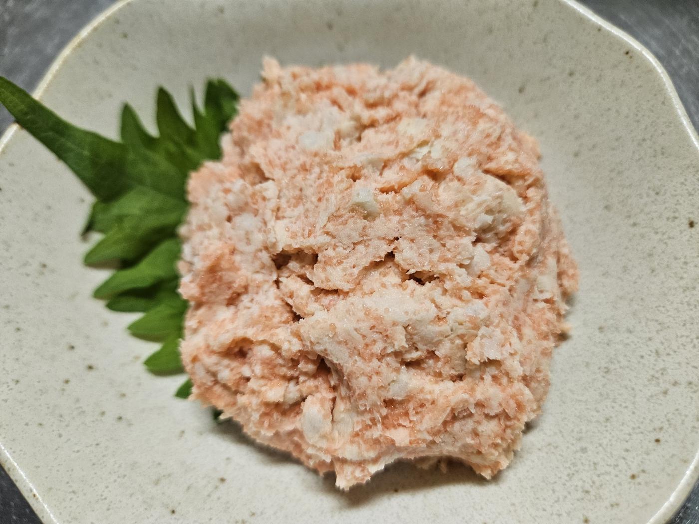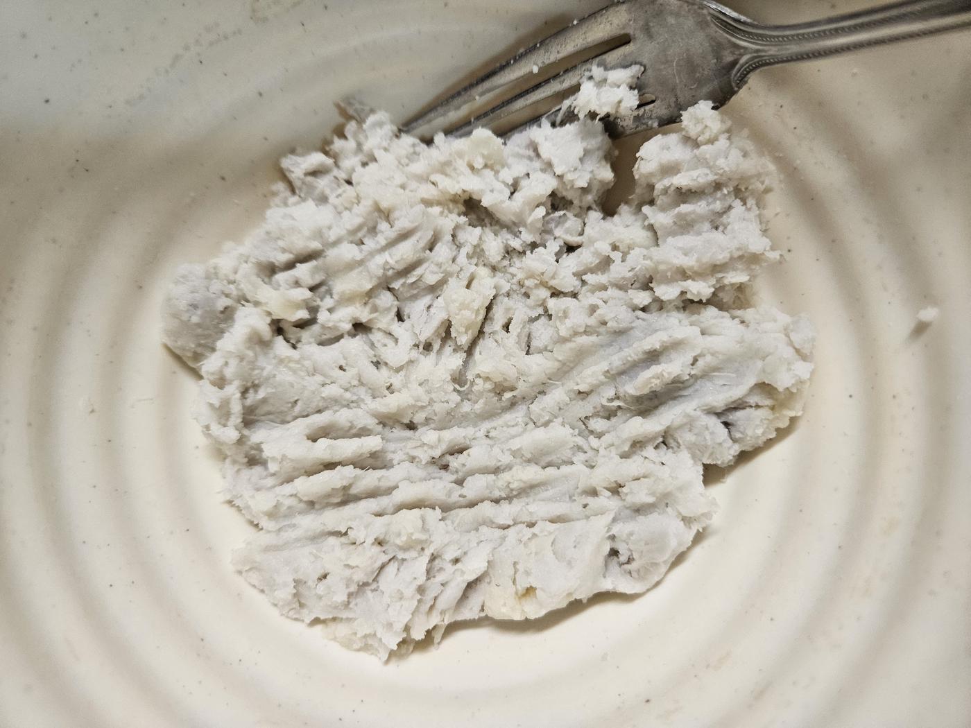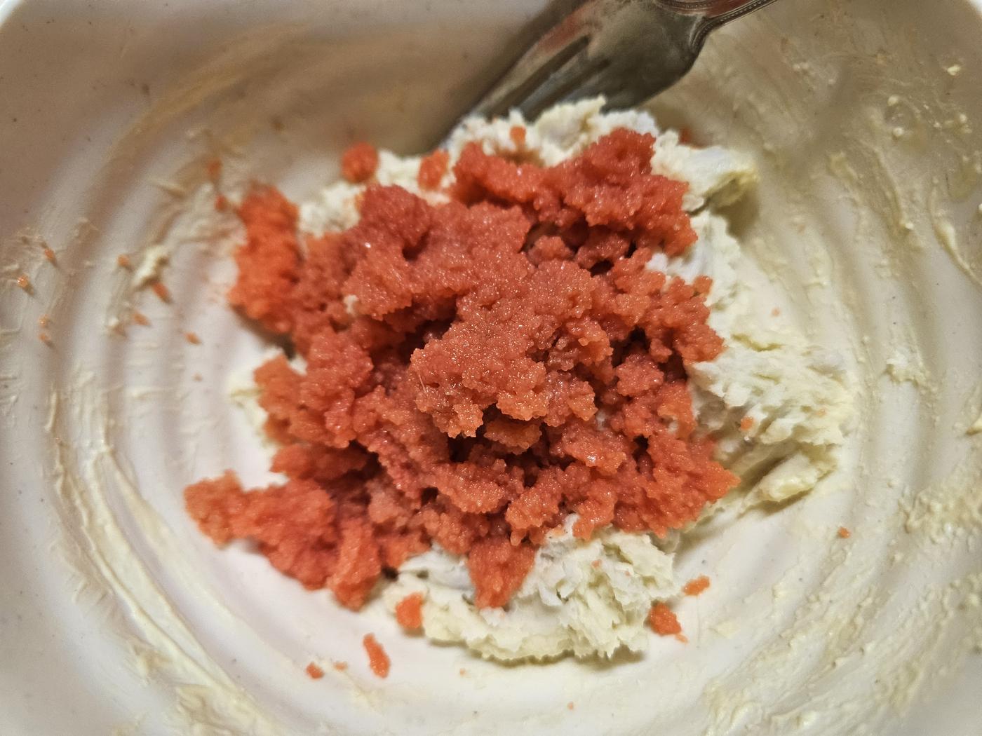 さといもマヨに皮を取り除いたタラコを投入して、さらに混ぜ合わせます。