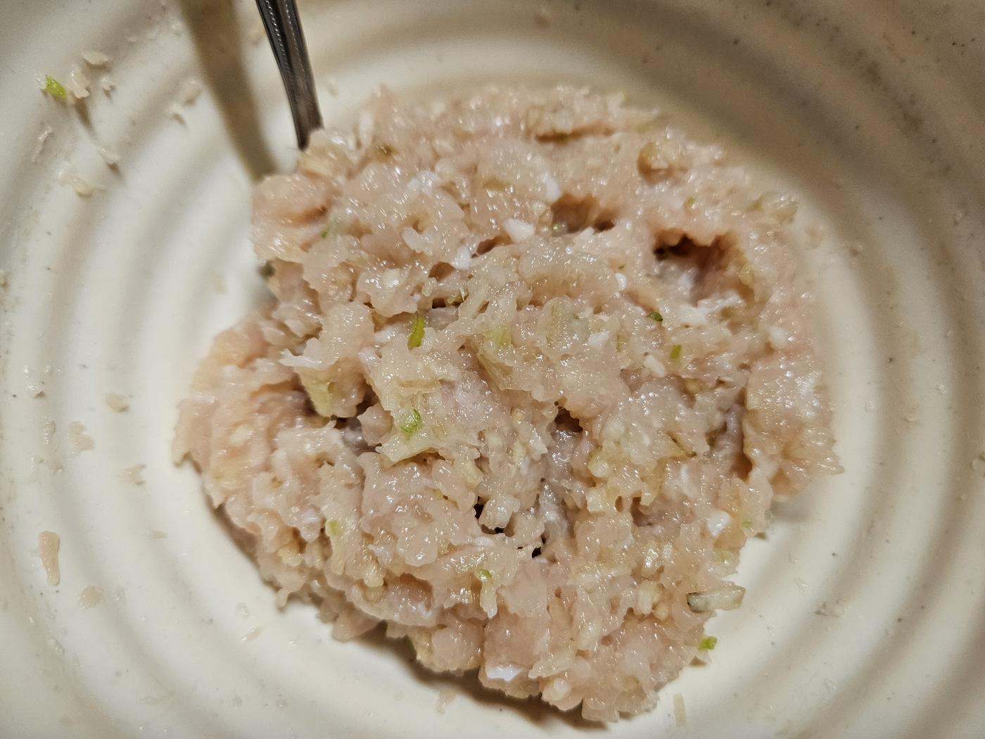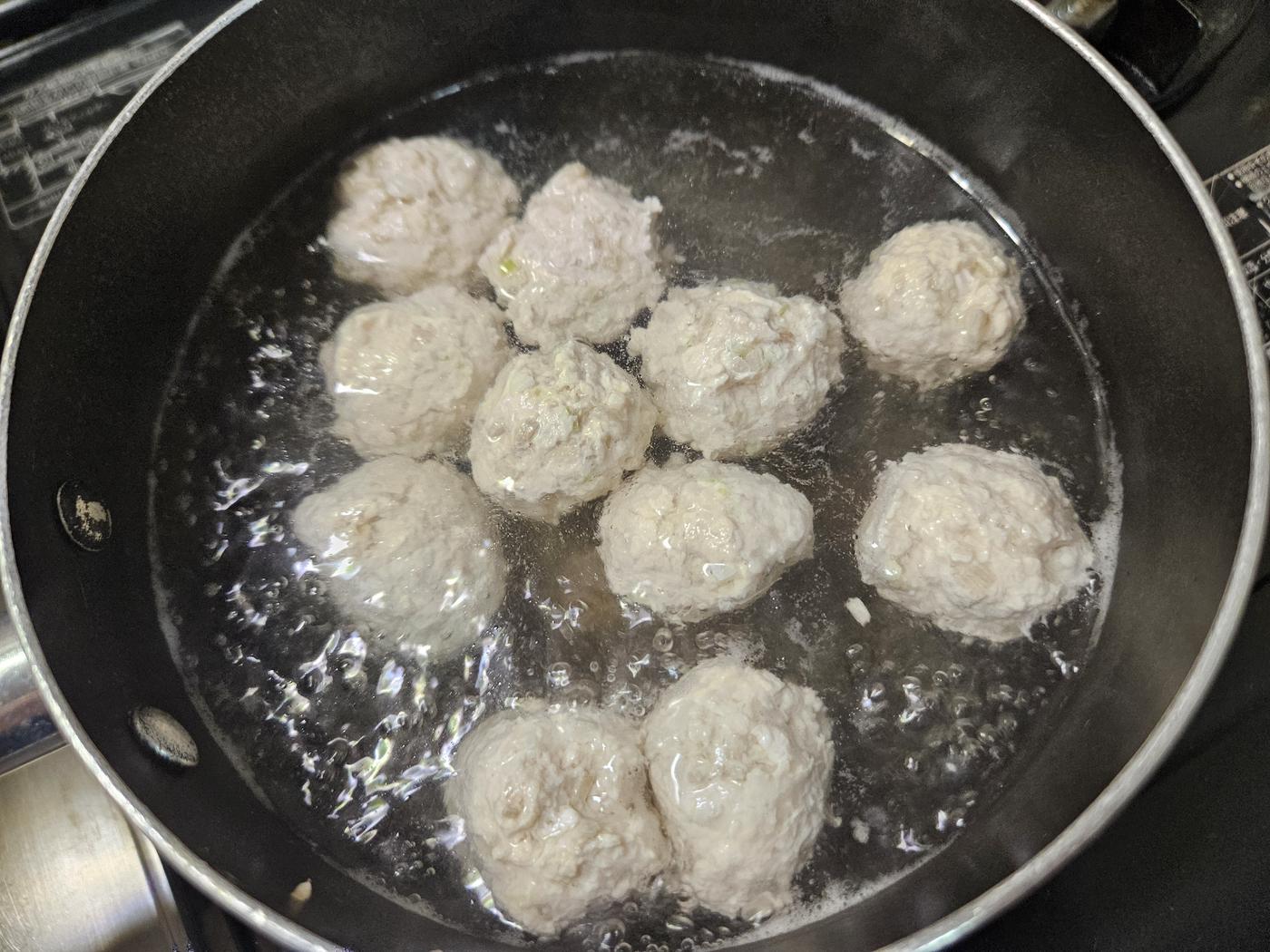 ダシをとった汁の上で、スプーン2つを使って丸めた鶏団子を1個ずつ投入。