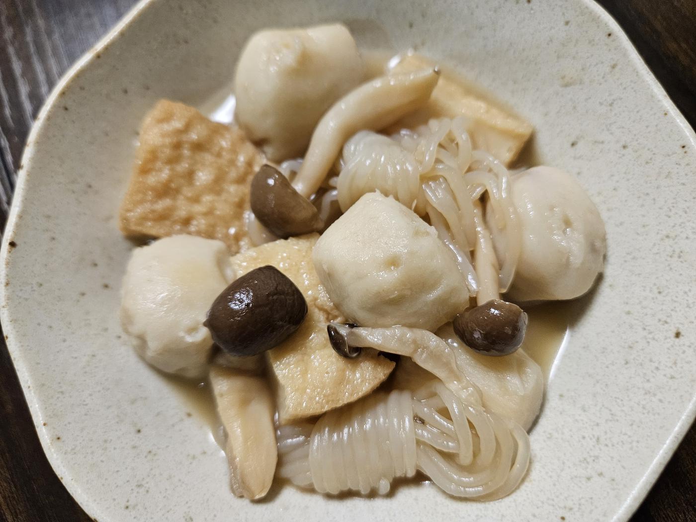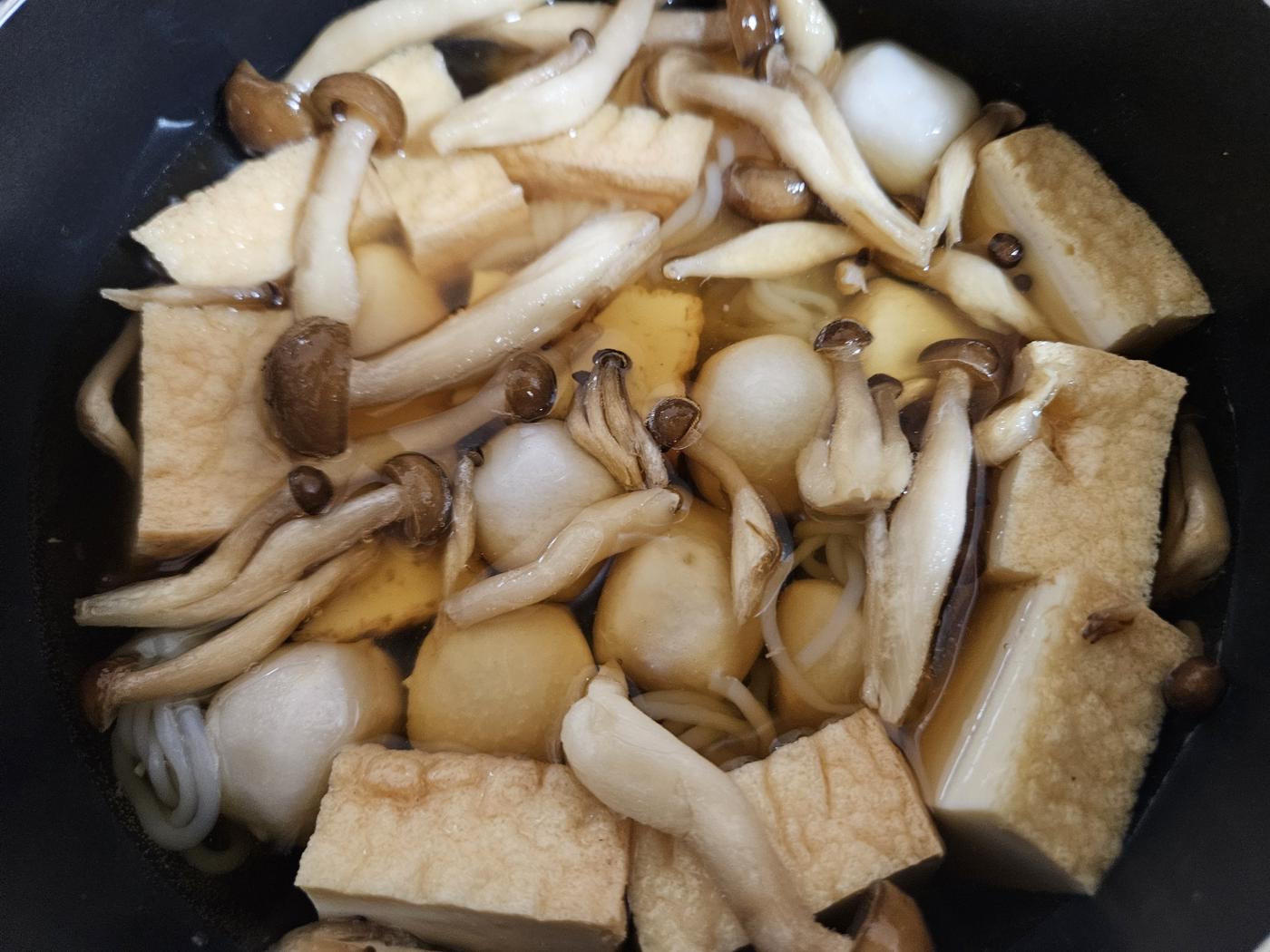 水で薄めためんつゆをベースに、さといも、食べやすいサイズにカットした厚揚げ、冷蔵庫で出番を待っていたしらたき、冷凍してあったしめじがあったのでそれも投入して、あとは火加減を見ながら15~20分くらい煮ました。