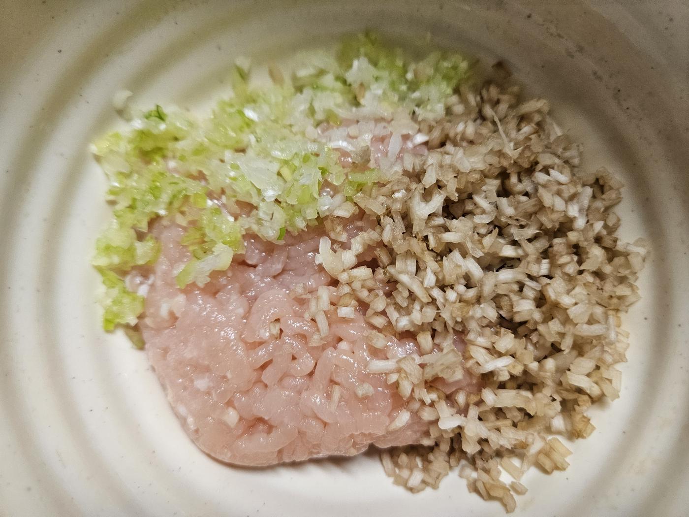 鶏のひき肉にみじん切りにしたネギを入れ、細切りのゴボウも購入したのでそれもさらにみじん切りにして混ぜます。