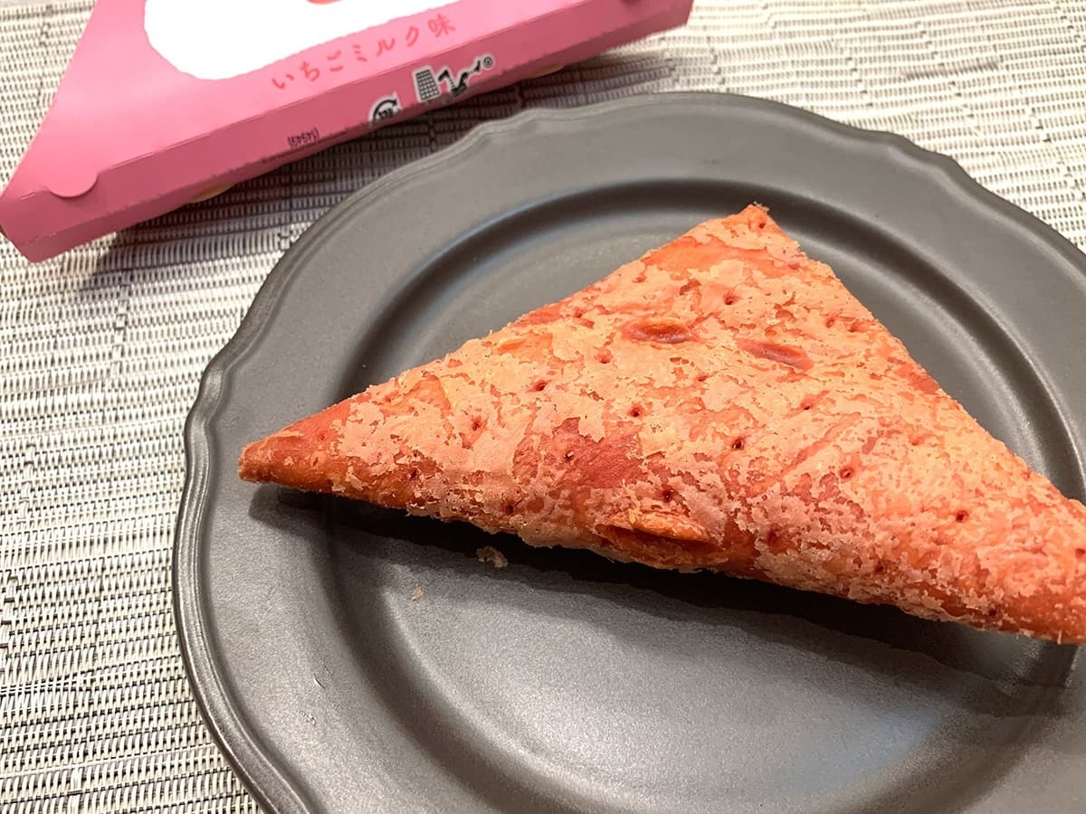 お皿に取り出してみた写真がこちらです。ピンク色に焼き上げられた三角チョコパイで、スイーツらしい甘い雰囲気を演出!