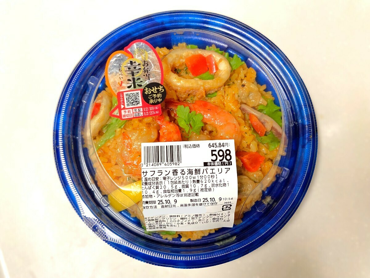 スーパーのお弁当とは思えないほど見た目も華やかで海鮮がごろっとのった、おしゃれなパエリアは売り場でも存在感抜群。
