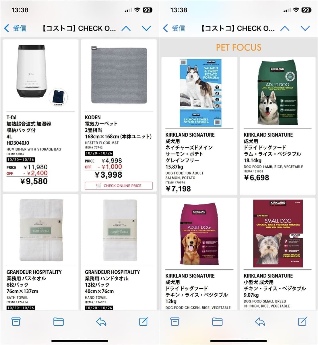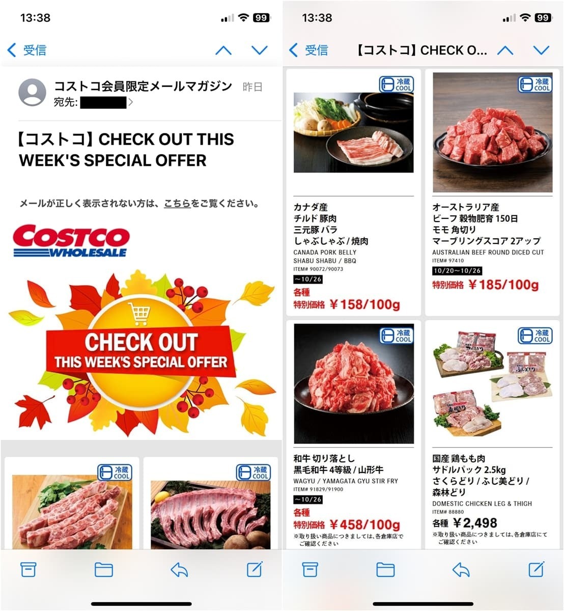 コストコのメルマガでは割引情報が配信されていますが、意外にも商品量は多くお得な情報が満載です!