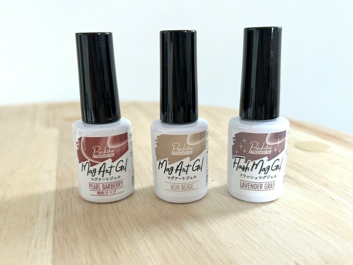 今回はその豊富なバリエーションの中でも、定番のマグアートジェルとその微粒子タイプ、カメラのフラッシュで強く輝くフラッシュマグジェルの3種類を購入。