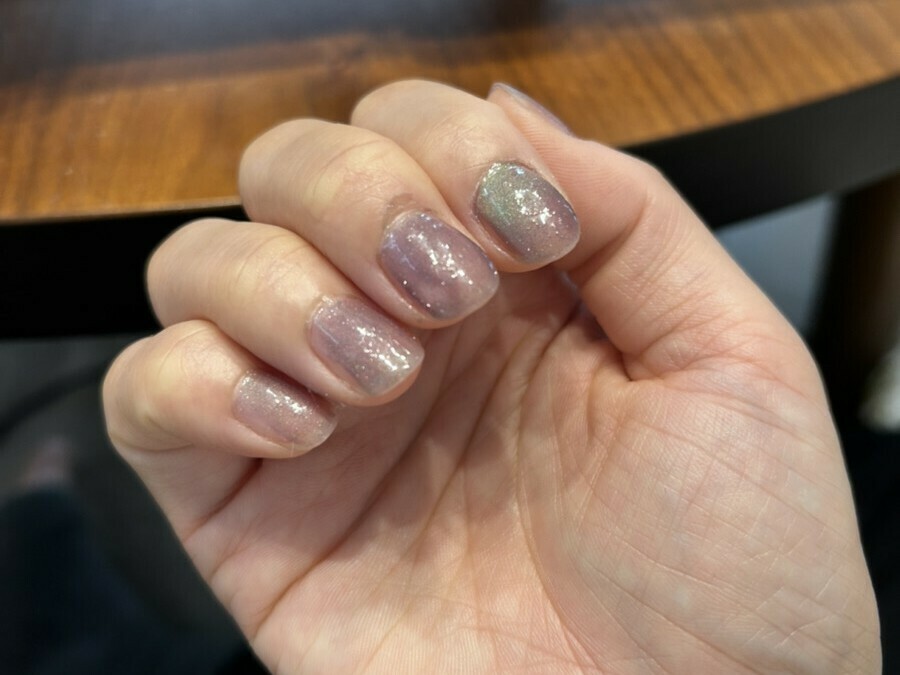 カメラのフラッシュで強く輝くラメが入ったタイプで、色はラベンダーグレーです。