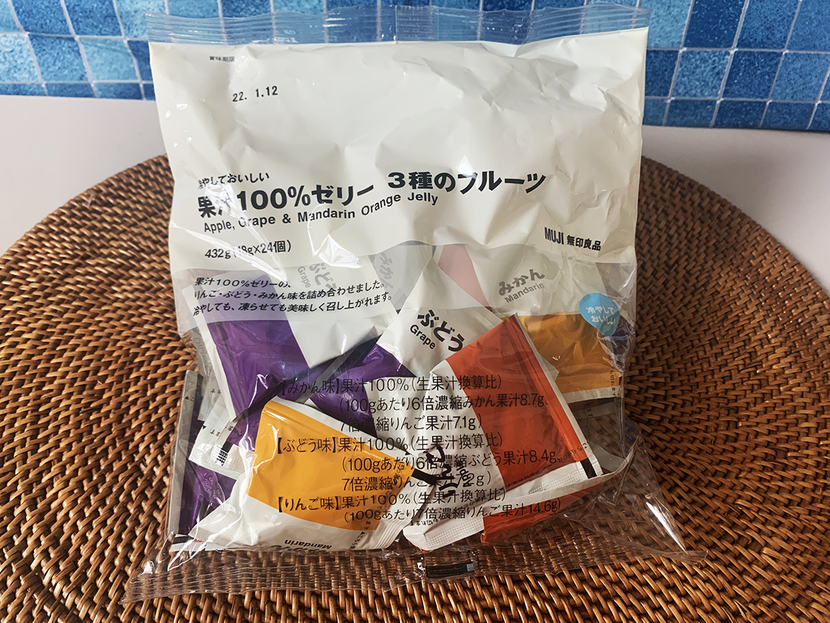「果汁100%ゼリー 3種のフルーツ」は、その名の通り、果汁100%で作られたゼリーです。みかん、りんご、ぶどうという3つの味がそれぞれ8個ずつ、合計24個入っています。