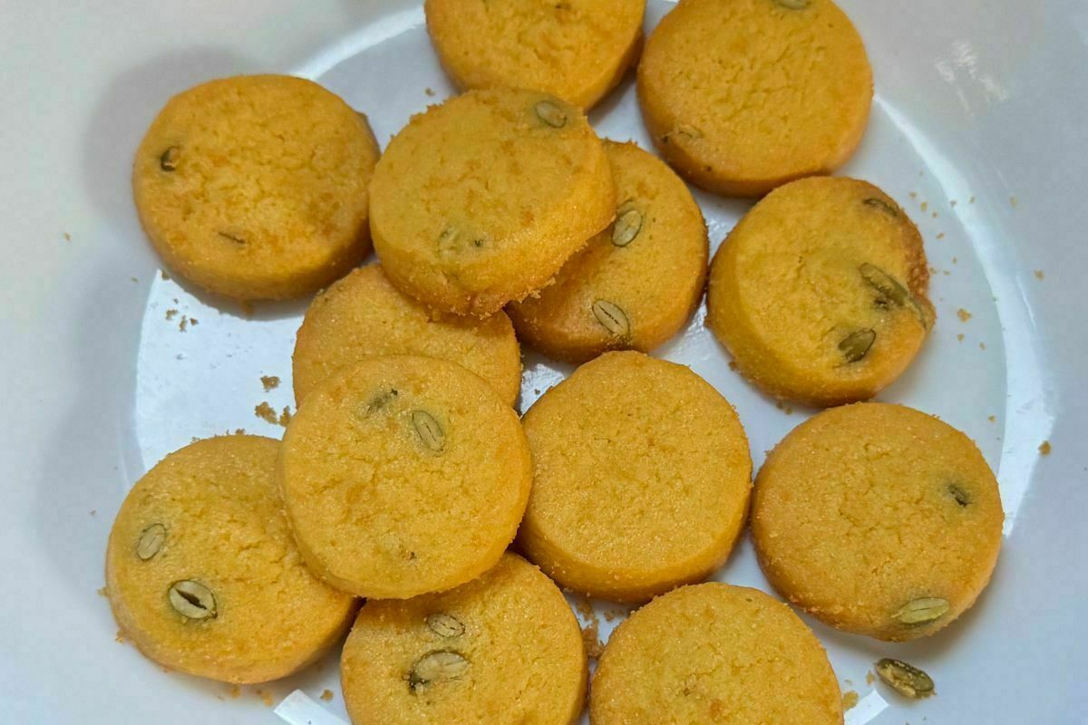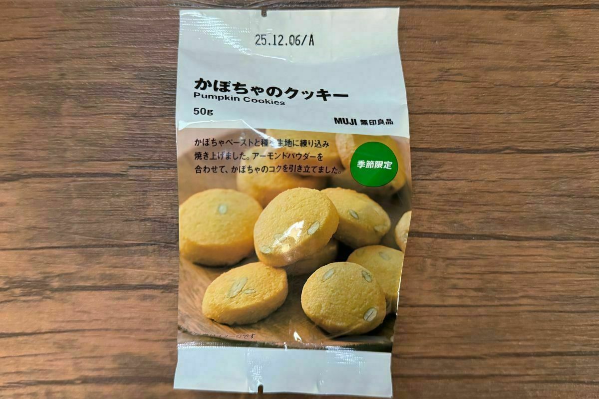 袋を開けると、かぼちゃの香りが食欲をそそります。丸くて可愛らしいクッキーの表面には、アクセントとしてピスタチオが埋め込まれています。