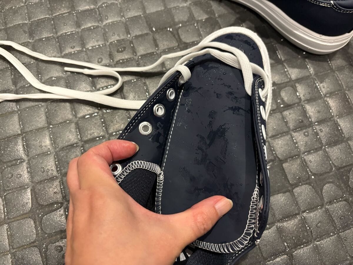 素材は合成皮革とゴム底なのでしっかりと水を弾いているのがわかります。
