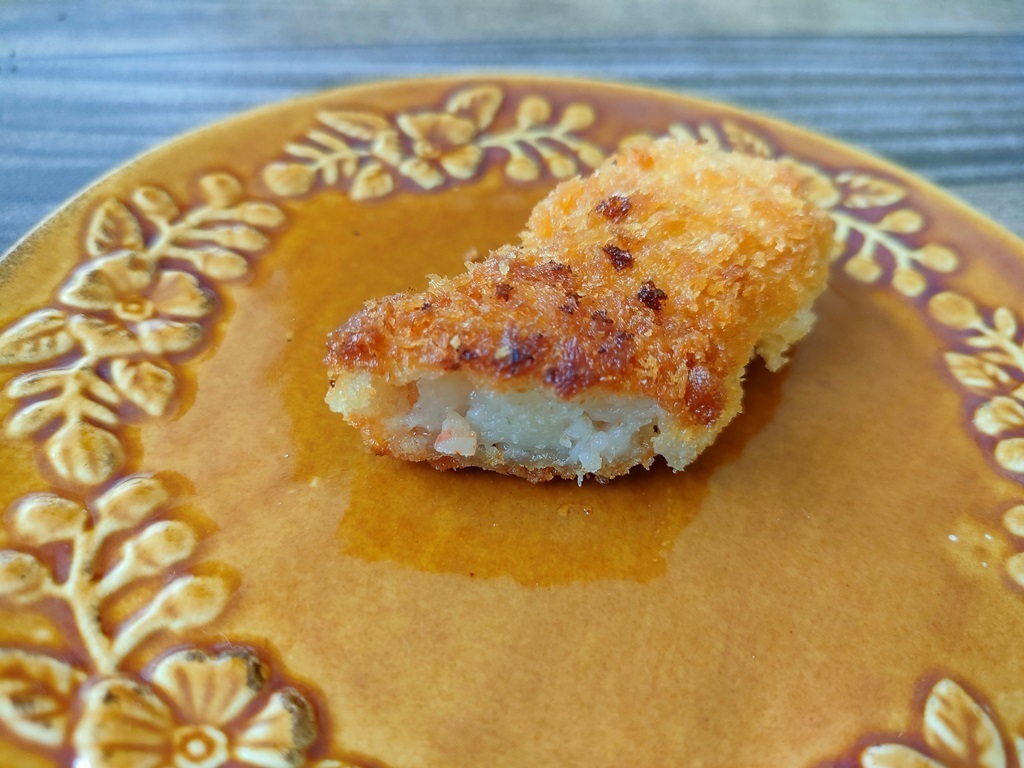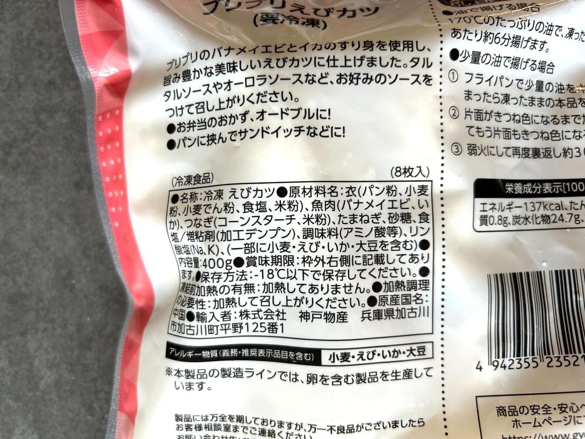 裏面の名称には「魚肉すり身フライ」と書かれていて、エビ以外にイトヨリという魚が使われています。