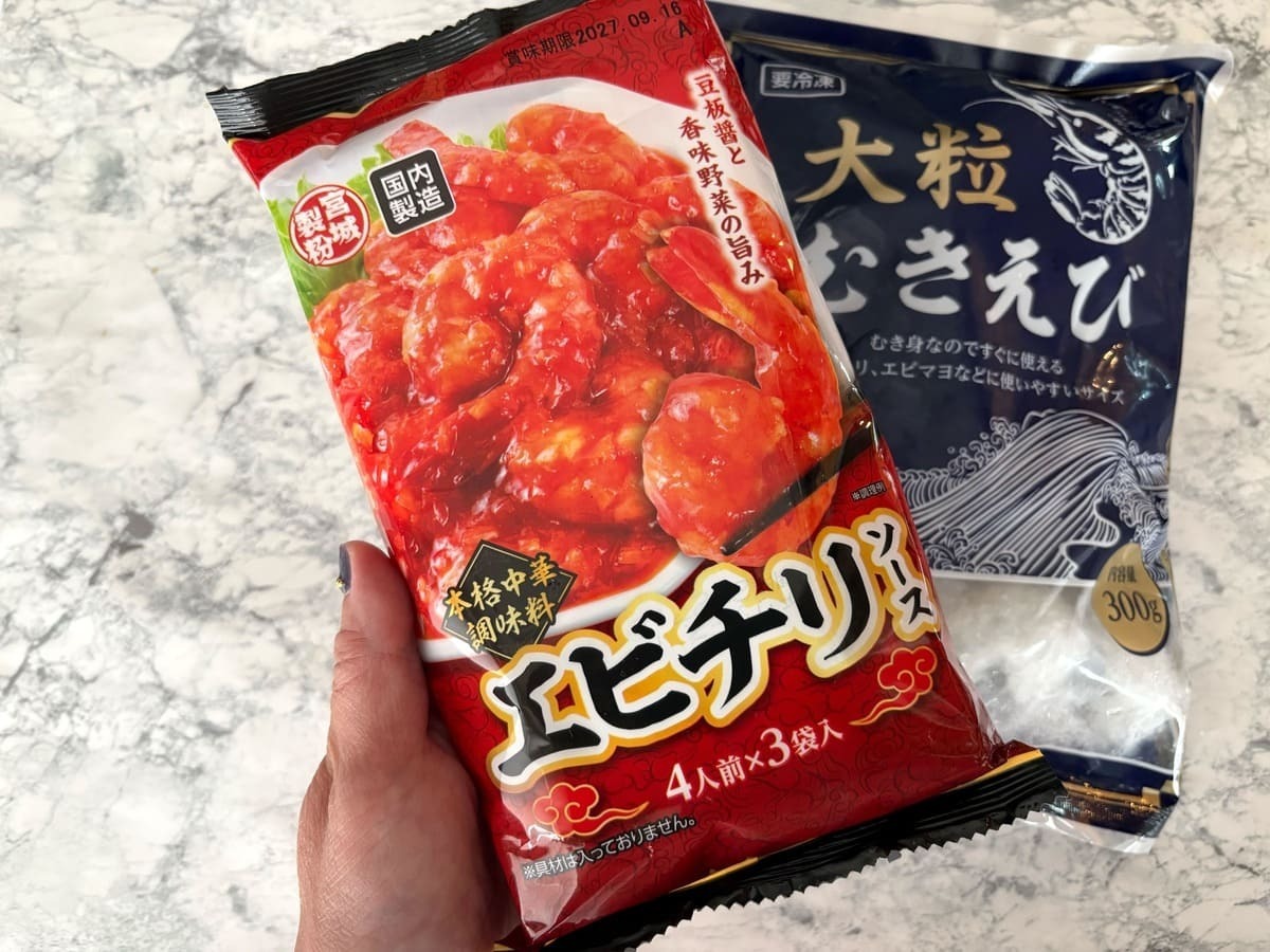 今回はむきえびに合わせて、業務スーパーに売っていたエビチリソースも購入し、エビチリを作りました。