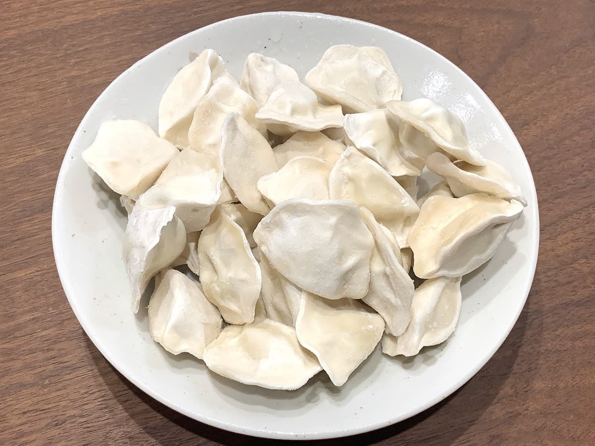 スープ餃子に入っていそうなやや小ぶりの餃子、皮が分厚いのが見てわかります。
