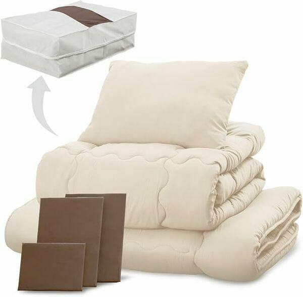 掛け布団から、敷布団、枕、それぞれのカバー、収納袋まで揃います。