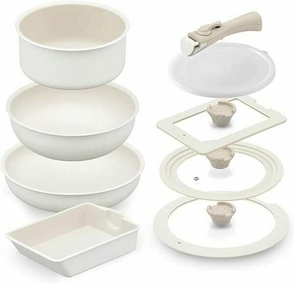 取っ手が外せるので、そのまま食卓へ出したり保存したりできるほか、ガラスふたの溝には菜箸などを置くことが可能です。また、重ねて収納できるため、省スペースで整理できますよ♪