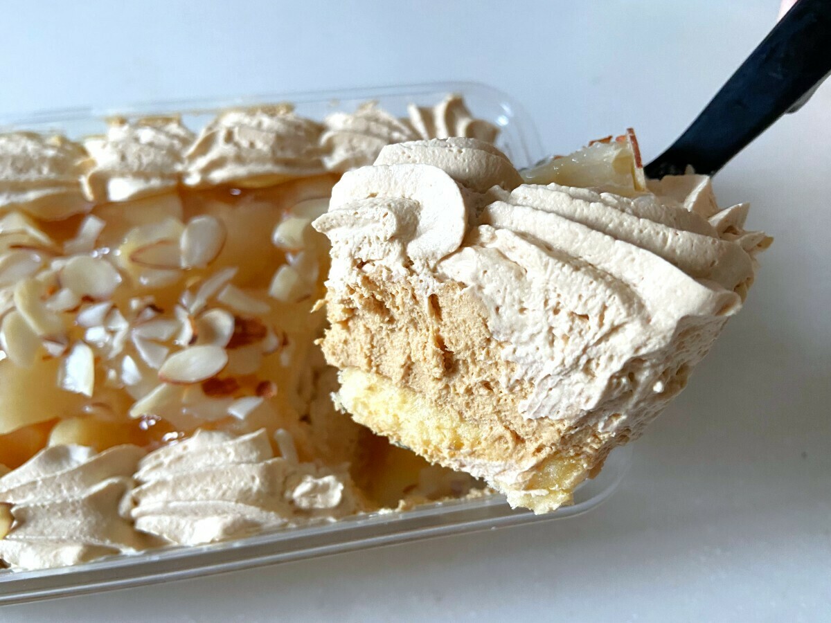コストコのスイーツコーナーに新登場のキャラメル&洋梨のスコップケーキは、気軽にすくって食べられるのが魅力の大きくて本格的なケーキ!