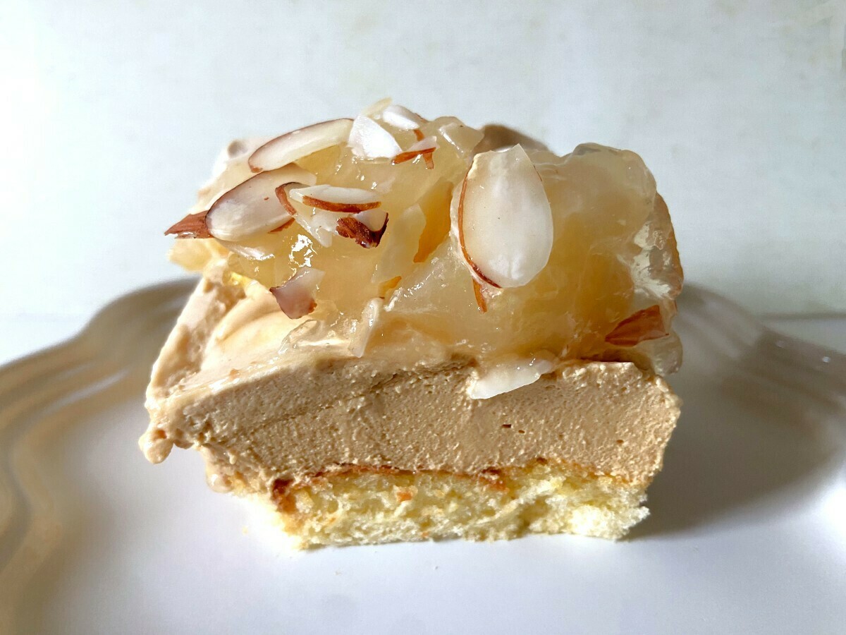 今回のキャラメルと洋梨のスコップケーキもひとくち食べて驚いたのがキャラメルムース部分がほろ苦く、甘さとのバランスが絶妙なこと。