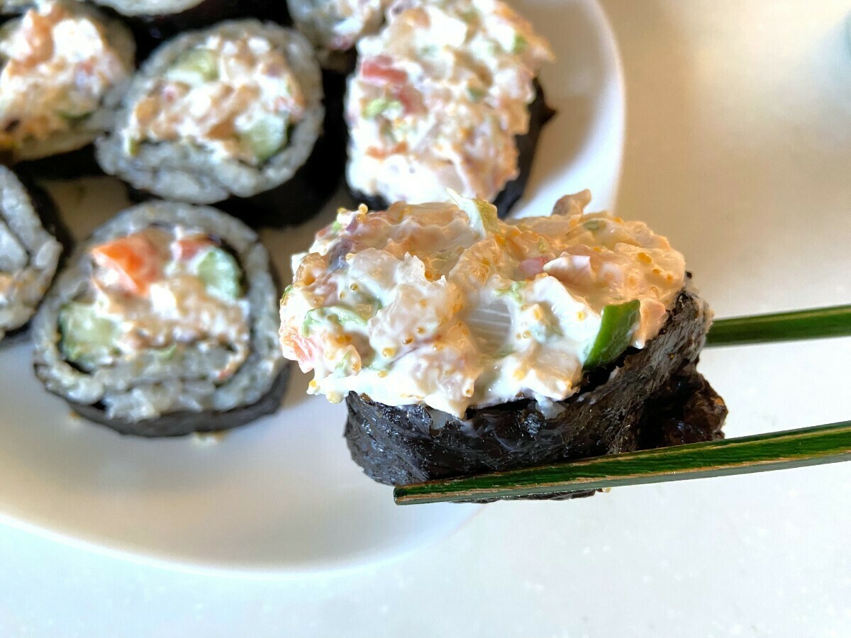 これまで鉄火巻き、とろたく、サーモン、鯛、ぶり、かに、ほたてなどさまざまな具材のほぼ具海鮮巻きが登場してきましたが、最近新たに仲間入りしたのが「海鮮サラダ巻き」。