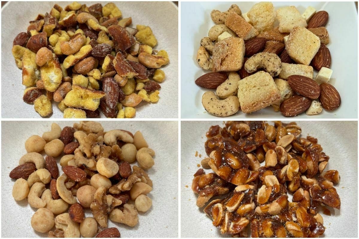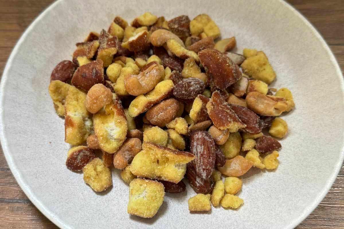 ほんのりチーズ味のクルトンとフリーズドライチーズが良いアクセントになり、シンプルなアーモンドと、黒胡椒がしっかり効いたカシューナッツの対比も楽しめます。