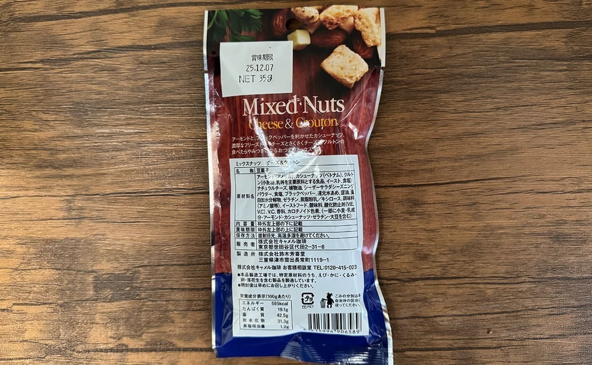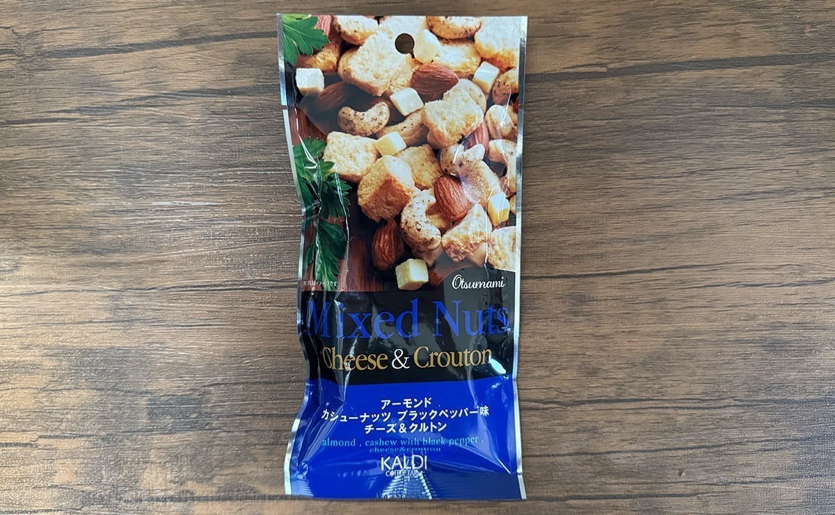アーモンド、ブラックペッパー風味のカシューナッツ、フリーズドライチーズ、そしてサクサクのクルトンをミックスしたカルディオリジナル商品(35g)です。