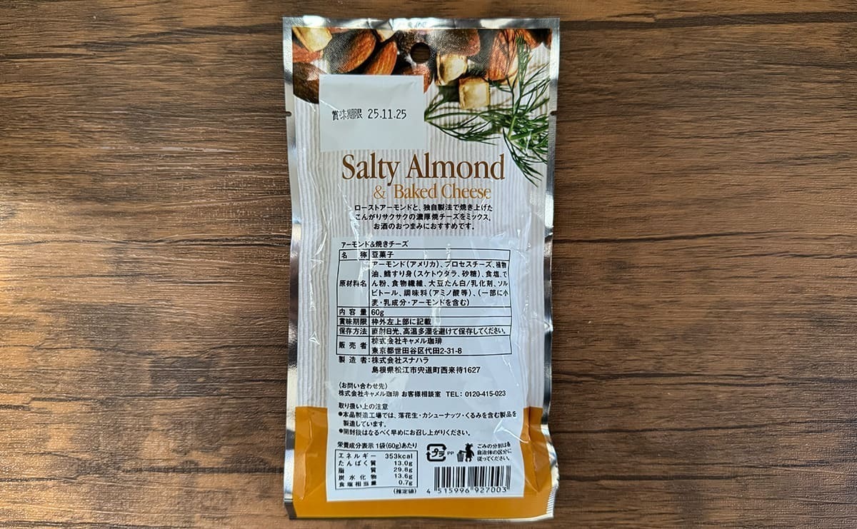 アーモンドは塩気が強すぎないシンプルな味付けですが、一緒に入っているチーズの風味が微かに移り、良いアクセントになっています。