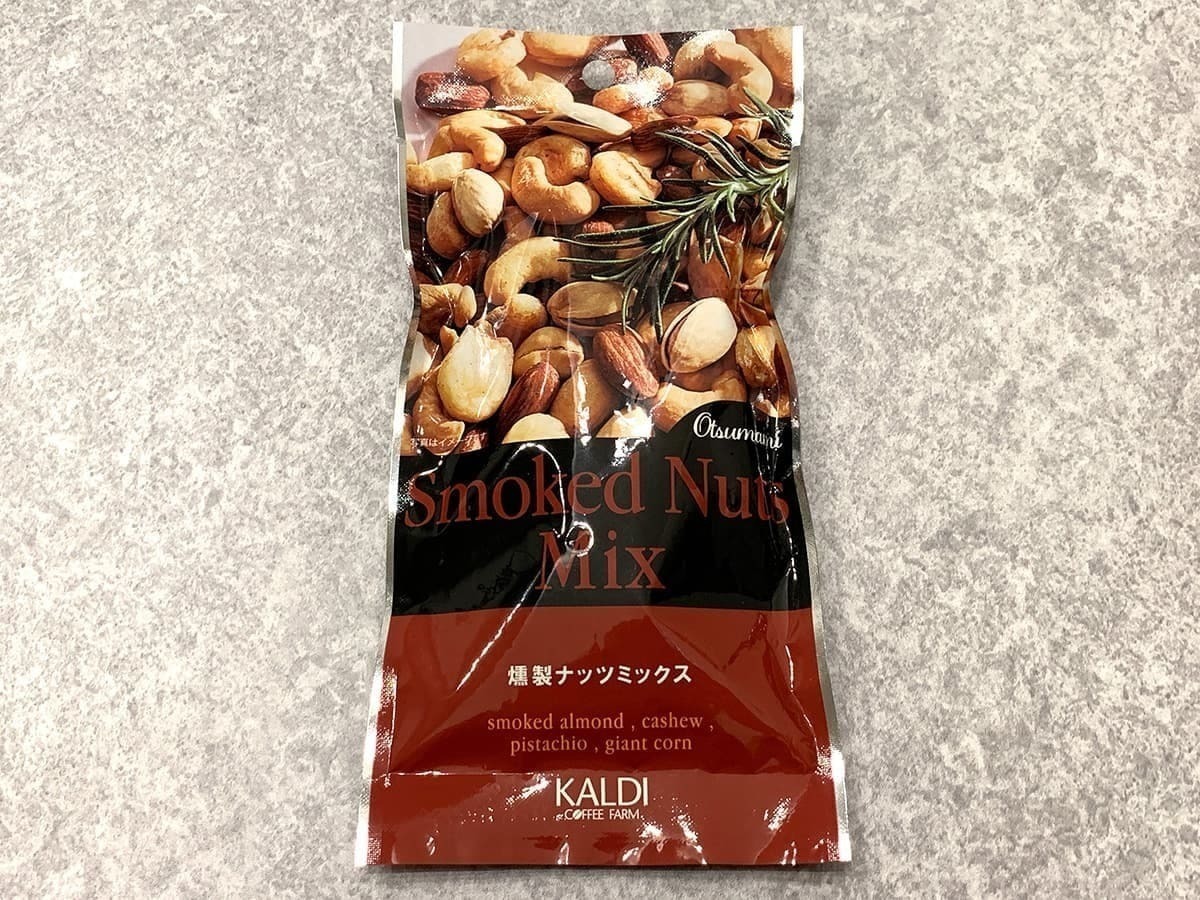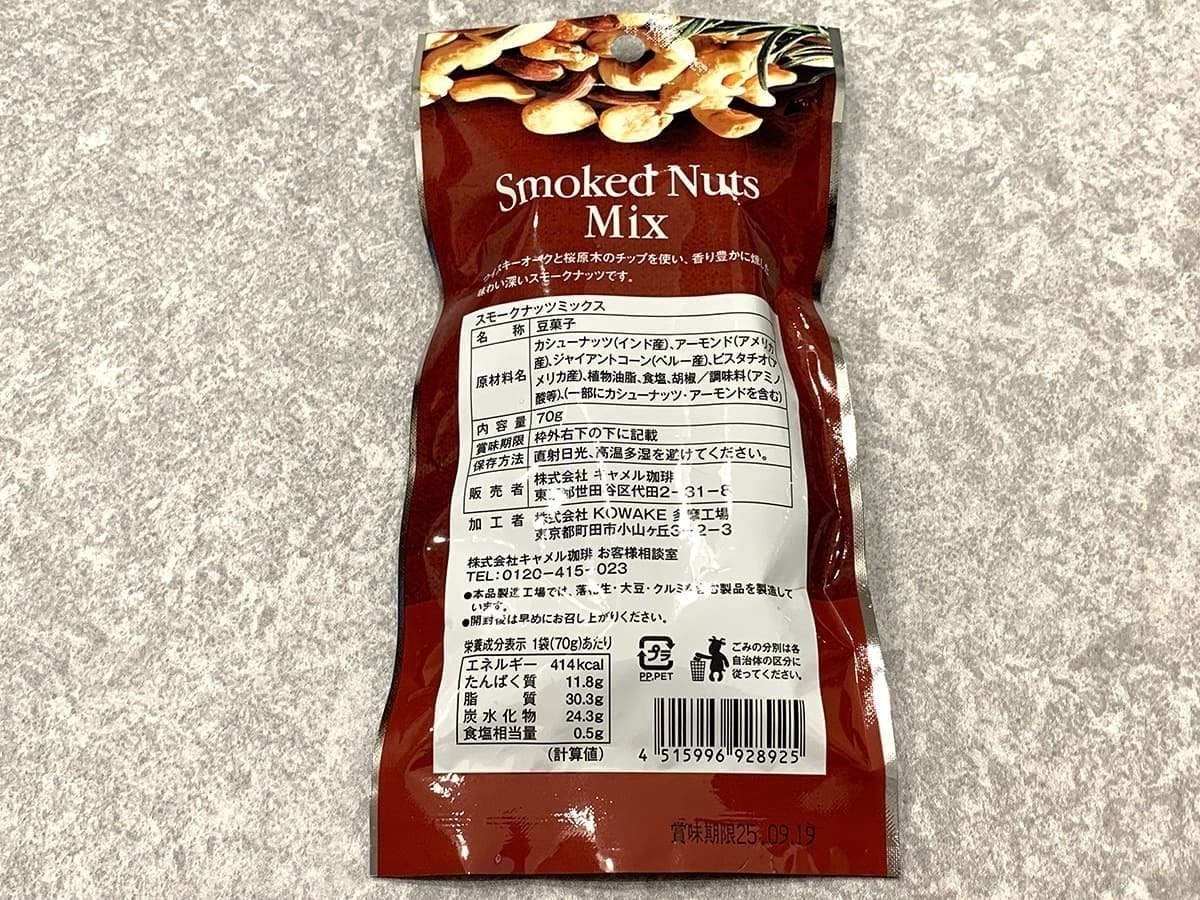 カシューナッツ、アーモンド、ジャイアントコーン、ピスタチオの4種類を燻製にしたナッツミックスです。